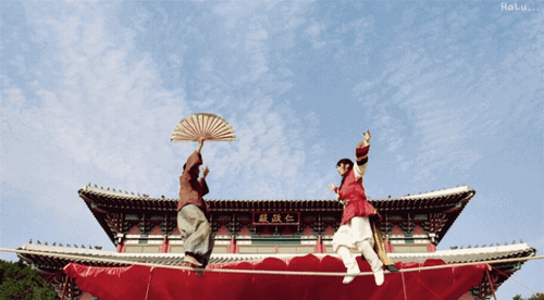‘너는 다시 태어나면 뭐로 태어나고 싶으냐? 양반?’ ‘아니’ ‘그럼 왕?’ ‘아니’ ‘그럼 뭐로 태어나고 싶으냐?’ 높은 외줄 위에서 광대들은 소리칩니다. ‘나는 다시 태어나도 광대지’하며 두 광대가 하늘 높이 뛰어 오릅니다.