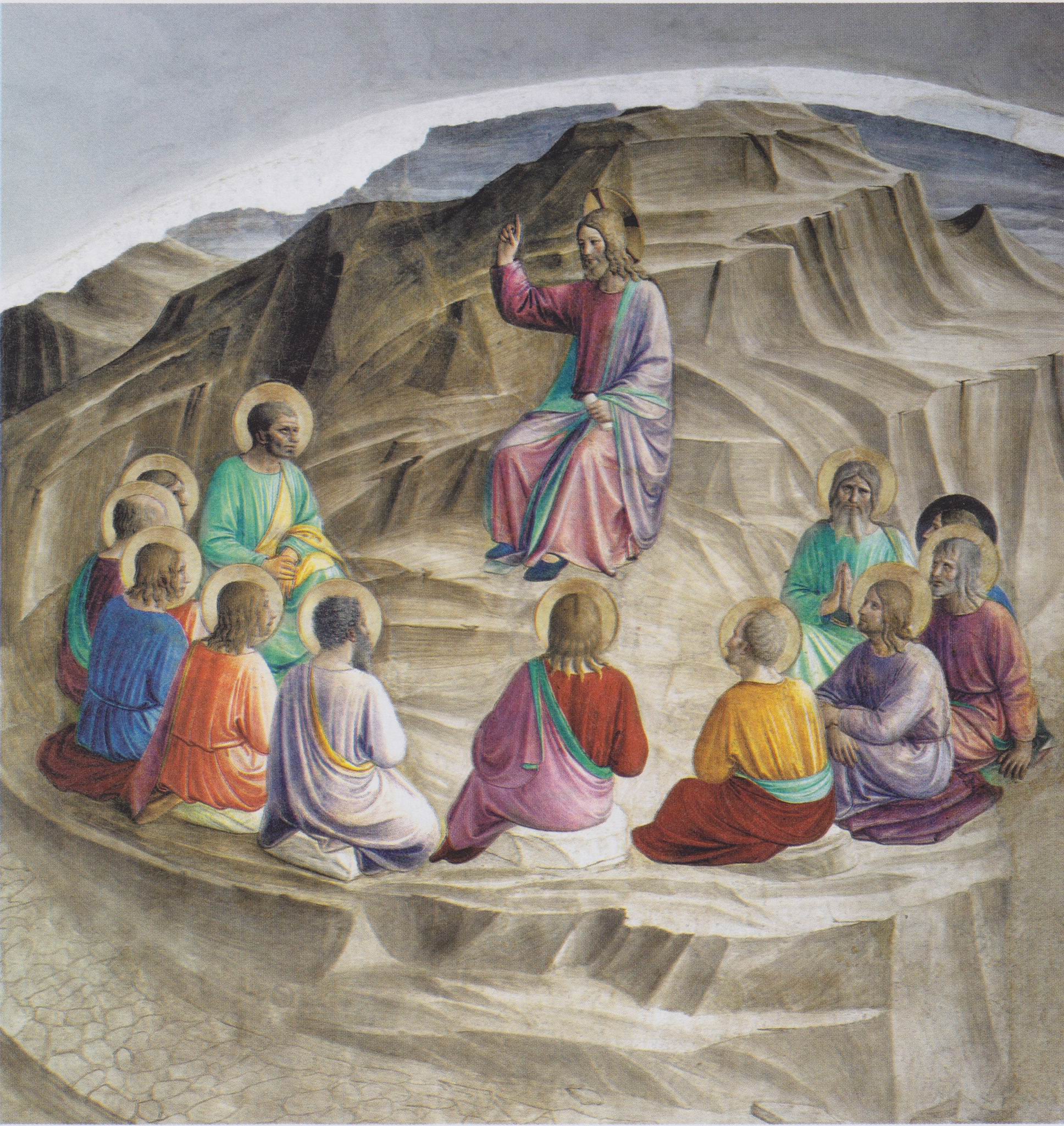 프라 안젤리코가 그린 그림에도 이 분위기가 잘 담겨 있습니다. 산은 울창한 나무도 없는 황량한 돌산이지만, 그 단순함은 오히려 말씀을 강조합니다. 제자들의 옷은 저마다 다른 색깔을 하고 있지만, 그들이 고요히 앉아 있는 모습은 통일된 질서를 이루고 있습니다. 모든 시선은 예수님께 집중됩니다. 세상의 화려함이 사라지고 오직 말씀만 남는 순간입니다.