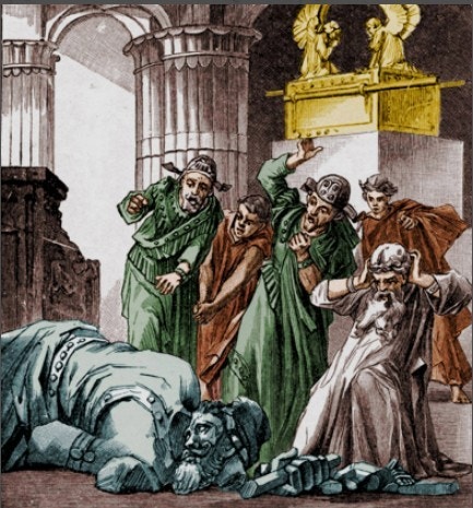 "블레셋 사람들이 하나님의 궤를 빼앗아 가지고 에벤에셀에서부터 아스돗에 이르니라. 블레셋 사람들이 하나님의 궤를 가지고 다곤의 신전에 들어가서 다곤 곁에 두었더니. 아스돗 사람들이 이튿날 일찍이 일어나 본즉 다곤이 여호와의 궤 앞에서 엎드러져 그 얼굴이 땅에 닿았는지라 그들이 다곤을 일으켜 다시 그 자리에 세웠더니. 그 이튿날 아침에 그들이 일찍이 일어나 본즉 다곤이 여호와의 궤 앞에서 또다시 엎드러져 얼굴이 땅에 닿았고 그 머리와 두 손목은 끊어져 문지방에 있고 다곤의 몸뚱이만 남았더라. 그러므로 다곤의 제사장들이나 다곤의 신전에 들어가는 자는 오늘까지 아스돗에 있는 다곤의 문지방을 밟지 아니하더라." (사무엘상 5:1~5)
