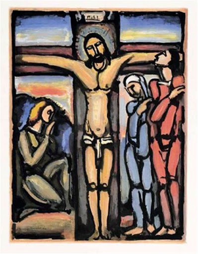 조르주 앙리 루오(Georges Henri Rouault)의 그림은 바로 이 장면을 깊은 묵상으로 담아냅니다. 그는 단순히 예수님의 십자가 고통을 사실적으로 그리려 하지 않았습니다. 대신 빛과 어둠, 색과 표정, 그리고 인물들의 자리 배치를 통해 십자가가 우리에게 던지는 영원한 메시지를 전하고자 했습니다.