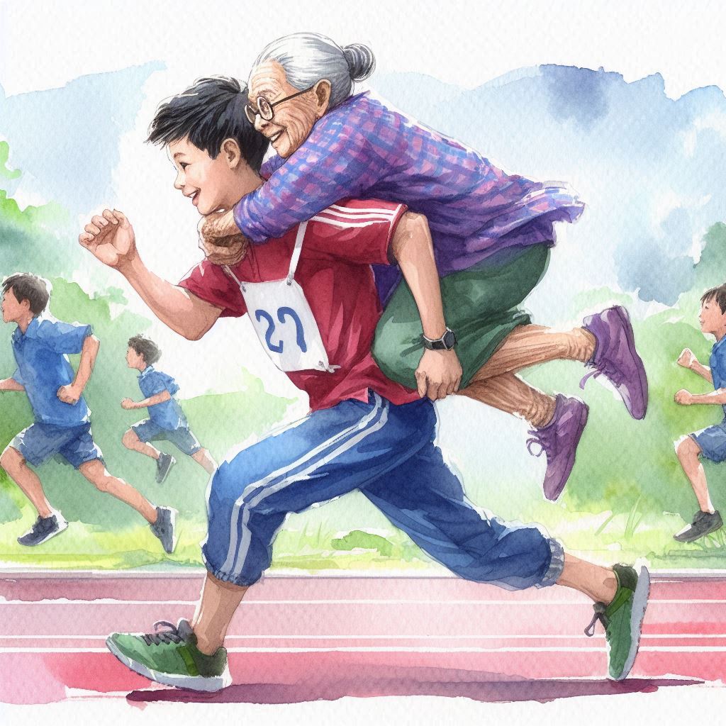 이날 대회의 하이라이트는 뭐니 뭐니 해도 부모님을 등에 업고 운동장을 한 바퀴 도는 효도관광 달리기 대회였습니다. 그런데 참가자들이 하나 둘 출발선상에 모이면서 한껏 고조됐던 분위기가 갑자기 숙연해지기 시작했습니다.