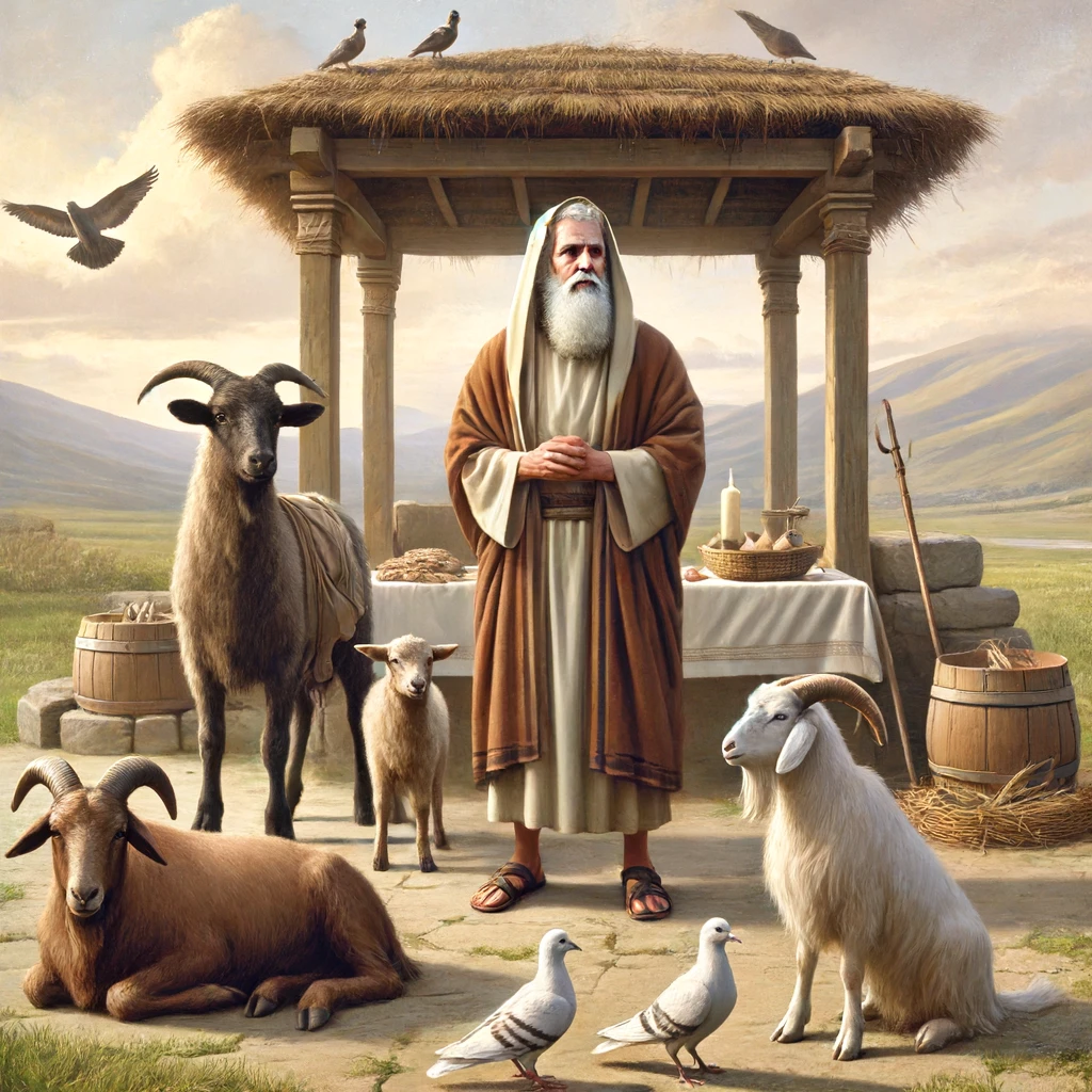 "하나님이 아브람에게 말씀하셨다. '나는 주님이다. 너에게 이 땅을 주어서 너의 소유가 되게 하려고, 너를 바빌로니아의 우르에서 이끌어 내었다.' 아브람이 여쭈었다. '주 나의 하나님, 우리가 그 땅을 차지하게 될 것을 제가 어떻게 알 수 있습니까?' 주께서 말씀하셨다. '나에게 삼 년 된 암송아지 한 마리와 삼 년 된 암염소 한 마리와 삼 년 된 숫양 한 마리와 산비둘기 한 마리와 집비둘기 한 마리씩을 가지고 오너라.' 아브람이 이 모든 희생제물을 주께 가지고 가서, 몸통 가운데를 쪼개어, 서로 마주 보게 차려 놓았다. 그러나 비둘기는 반으로 쪼개지 않았다. 솔개들이 희생제물의 위에 내려왔으나, 아브람이 쫓아 버렸다. 해가 질 무렵에, 아브람이 깊이 잠든 가운데, 깊은 어둠과 공포가 그를 짓눌렀다. 주께서 아브람에게 말씀하셨다. '너는 똑똑히 알고 있거라. 너의 자손이 다른 나라에서 나그네살이를 하다가, 마침내 종이 되어서, 사백 년 동안 괴로움을 받을 것이다. 그러나 너의 자손을 종살이하게 한 그 나라를, 내가 반드시 벌할 것이며, 그 다음에, 너의 자손이 재물을 많이 가지고 나올 것이다. 그러나 너는 오래오래 살다가, 고이 잠들어 묻힐 것이다. 너의 자손은, 사 대째가 되어서야 이 땅으로 돌아올 것이다. 아모리 사람들의 죄가 아직 벌을 받을 만큼 이르지는 않았기 때문이다.' 해가 지고, 어둠이 짙게 깔리니, 연기 나는 화덕과 타오르는 횃불이 갑자기 나타나서, 쪼개 놓은 희생제물 사이로 지나갔다." (창세기 15장 7~17절)