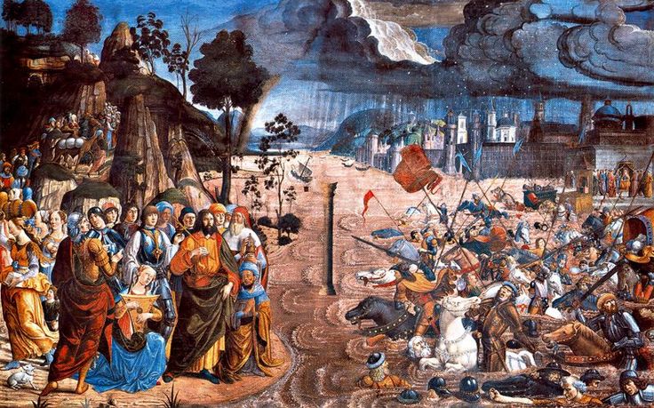 "모세가 바다 위로 손을 내밀매 여호와께서 큰 동풍이 밤새도록 바닷물 을 물러가게 하시니 물이 갈라져 바다가 마른 땅이 된지라 이스라엘 자손이 바다 가운데를 육지로 걸어가고 물은 그들의 좌우에 벽이 되니 애굽 사람들과 바로의 말들 병거들과 그 마병들이 다 그들의 뒤를 추격하여 바다 가운데로 들어오는지라 새벽에 여호와께서 불과 구름 기둥 가운데서 애굽 군대를 보시고 애굽 군대를 어지럽게 하시며 그들의 병거 바퀴를 벗겨서 달리기가 어렵게 하시니 애굽 사람들이 이르되 이스라엘 앞에서 우리가 도망하자 여호와가 그들을 위하여 싸워 애굽 사람들을 치는도다 여호와께서 모세에게 이르시되 네 손을 바다 위로 내밀어 물이 애굽 사람들과 그들의 병거들과 마병들 위에 다시 흐르게 하라 하시니 모세가 곧 손을 바다 위로 내밀매 새벽이 되어 바다의 힘이 회복된지라 애굽 사람들이 물을 거슬러 도망하나 여호와께서 애굽 사람들을 바다 가운데 엎으시니 물이 다시 흘러 병거들과 기병들을 덮되 그들의 뒤를 따라 바다에 들어간 바로의 군대를 다 덮으니 하나도 남지 아니하였더라."(출애굽기 14:21~28)